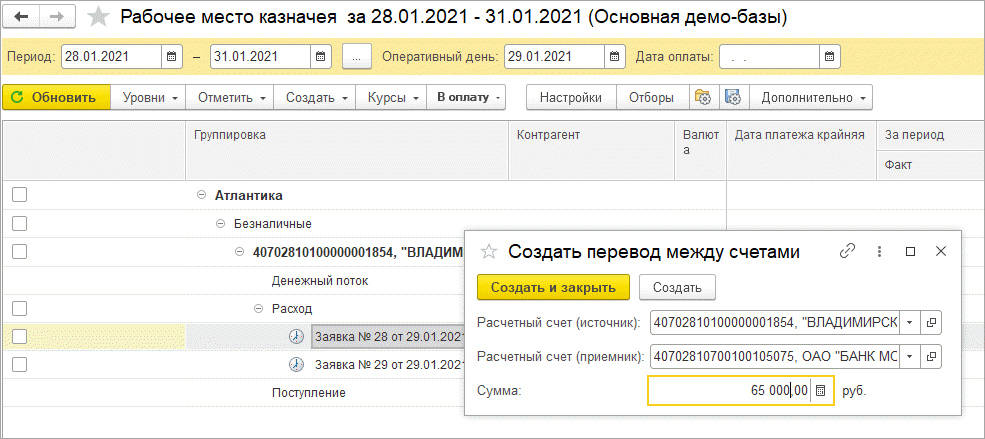 После нажатия кнопки «Создать» будет создана Заявка на расходование денежных средств с видом операции «Перевод на другой счет организации», заполнятся все реквизиты и будет попытка проведения документа. Если в момент проведения возникнет ошибка, то откроется форма документа, чтобы пользователь смог устранить ограничения для проведения. Расчетные счета автоматически заполнятся в созданной Платежной позиции.