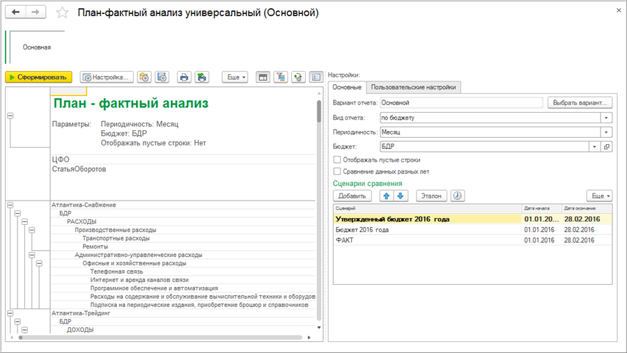 Примечание: В отчете "План-фактный анализ универсальный" настройка сценариев сравнения и вид отчета сохраняются только в варианте отчета. Эти настройки варианта будут действовать для всех пользовательских настроек, которые используют этот вариант.