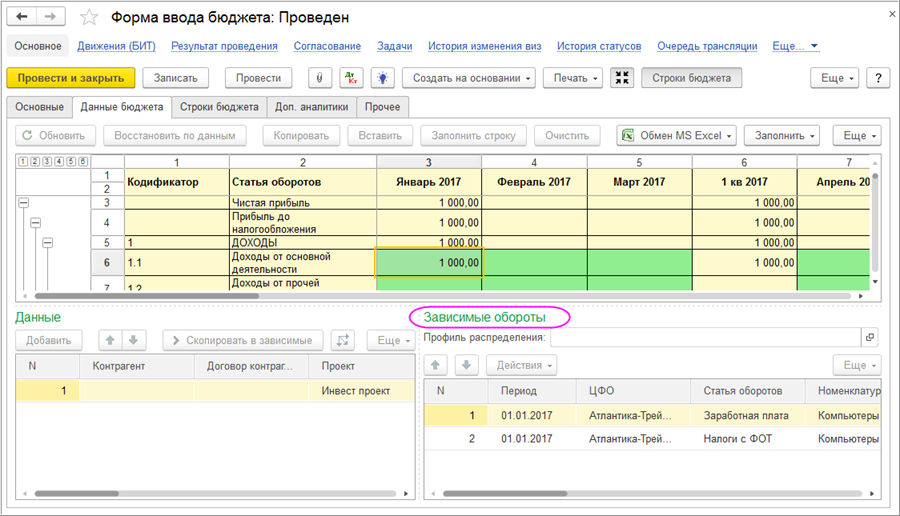 Расчет и планирование зависимых статей в соответствии с заданной структурой происходит в документах «Форма ввода бюджета» и «Бюджетная операция» одновременно с вводом исходной статьи. Это относится к зависимым оборотам, правила для которых заданы документами "Установка зависимых оборотов" с видом операции "Зависимые обороты".