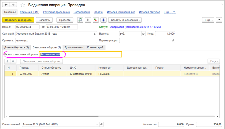Примечание. Также формирование зависимых оборотов предусмотрено в документах «Корректировка бюджета», «Распределение бюджета», «Актуализация бюджета», «Версия отчета», «Получение фактических данных».
