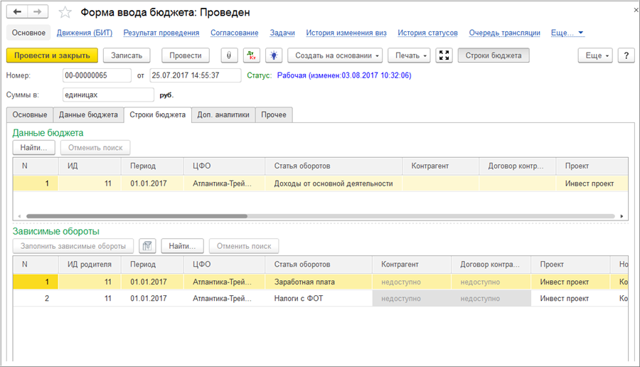 Просмотреть зависимые обороты можно на закладке «Строки бюджета» в поле «Зависимые обороты», заполненные данные недоступны для редактирования.