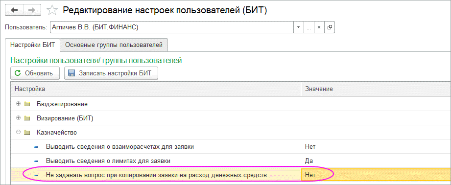 Если в какой-то момент потребуется снова копировать или наоборот не копировать платежные позиции, то вызвать окно с вопросом можно в Настройках пользователя (Настройки БИТ – Настройки пользователей и прав - Настройки пользователей):