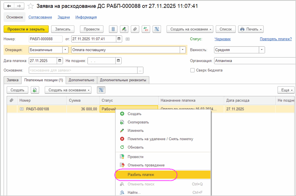 В «Заявке на расходование ДС» в списке платежных позиций реализована команда «Разбить платеж» (выбор команды при нажатии правой кнопкой мыши на выделенной позиции).