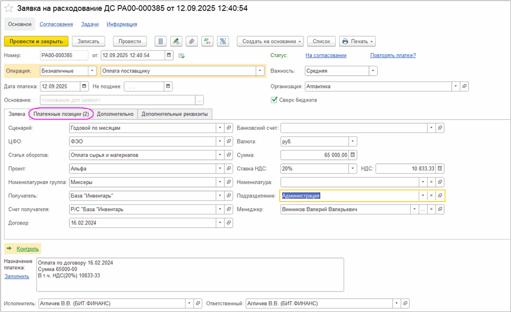 При записи "Заявки на расходование ДС" на закладке "Платежные позиции" создаются документы «Платежная позиция». При записи новой Заявки создается одна Платежная позиция. Но при необходимости можно оплатить заявку частями (в разные дни или с разных расчетных счетов), по одной заявке можно сделать несколько платежей. Таким образом, одна заявка может включать в себя несколько платежных позиций с разными датами оплаты и разными банковскими счетами организации.