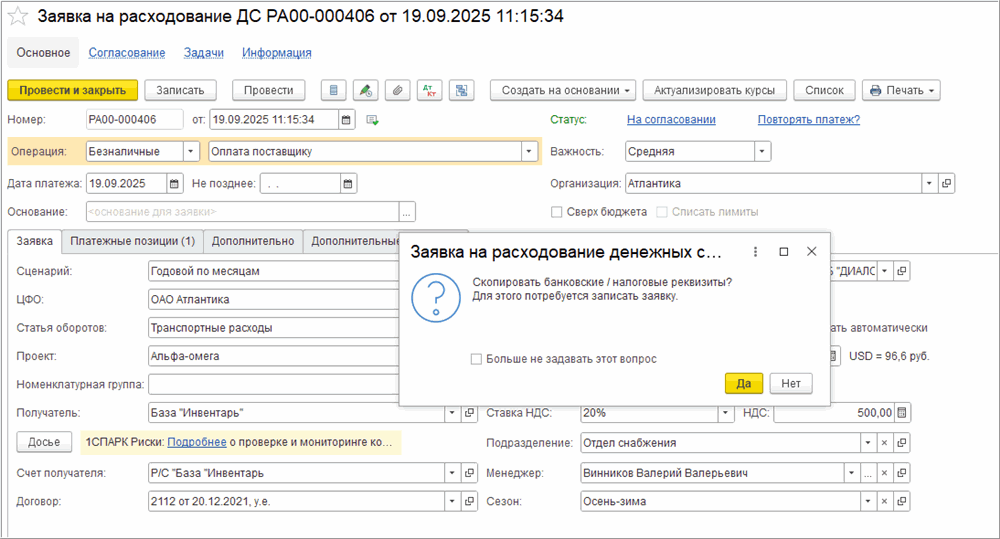 В системе реализовано копирование документа «Заявка на расходование денежных средств» с копированием платежных позиций. При этом копируются все банковские и налоговые реквизиты платежных позиций. Также нужно учитывать, что будут скопированы все платежные позиции исходного документа. При копировании Заявки на экране появляется вопрос «Скопировать банковские/налоговые реквизиты»? Если ответить «Да», то Заявка скопируется со всеми платежными позициями и указанными в них реквизитами. Если ответить «Нет», то создастся новая Заявка копированием, но платежная позиция создана не будет до записи документа, как и при обычном создании Заявки. Если не нужно, чтобы в дальнейшем вопрос выводился при копировании Заявки, то необходимо установить флаг «Больше не задавать этот вопрос» и сделать выбор Да или Нет. После этого при копировании Заявки вопрос появляться не будет, платежные позиции будут копироваться или нет зависит от ранее сделанного пользователем выбора.