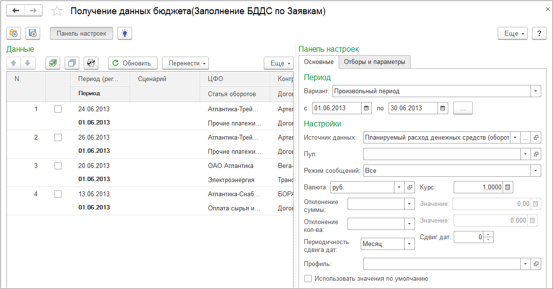 Примечание. С помощью данной обработки можно, например, заполнить оперативный бюджет движения денежных средств на основании созданных Заявок на расходование денежных средств и Планируемых поступлений денежных средств. Для этих целей в поставку включены предопределенные источники данных (раздел «Получение данных» - «Источники данных» - папка «Получение планируемых платежей и поступлений»).