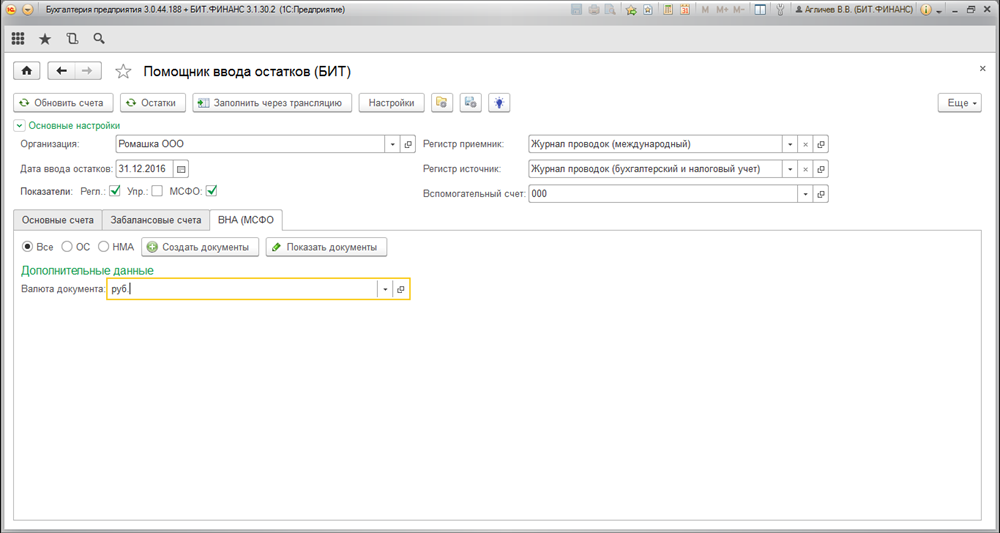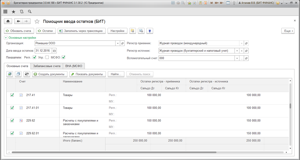 Для группового ввода начальных остатков по управленческому учету и МСФО служит обработка «Помощник ввода остатков (БИТ)».