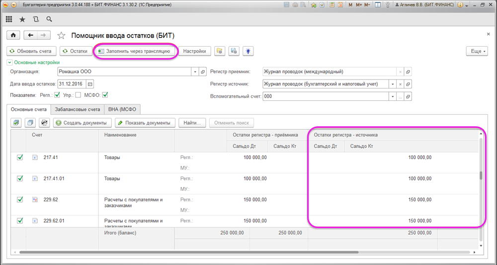 Суммовые показатели в колонке «Остатки регистра-источника» заполняются при нажатии на кнопку «Заполнить через трансляцию».
