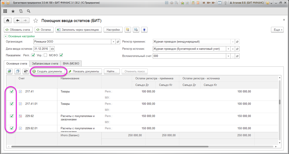 Для создания документов по вводу начальных остатков необходимо с помощью кнопки «Заполнить через трансляцию» заполнить колонку «Остатками регистра-источника», выделить флагами те строки, по которым требуются создать документы и нажать на кнопку «Создать документы»: