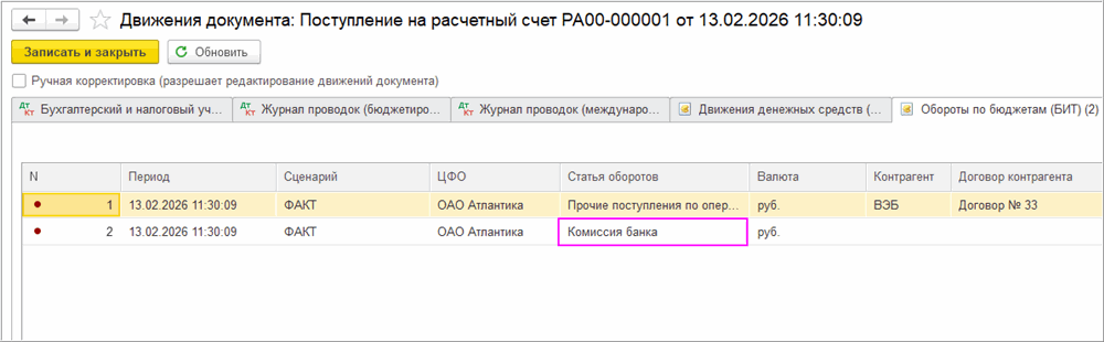 В документе «Поступление на расчетный счет» с видом операции «Поступление по платежным картам» при использовании встроенного механизма сбора факта формируется два движения в регистре «Обороты по бюджетам»: по БДДС - поступление денежных средств и по БДР - расходы на банковскую комиссию.