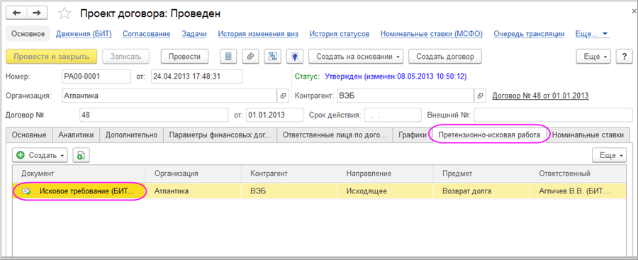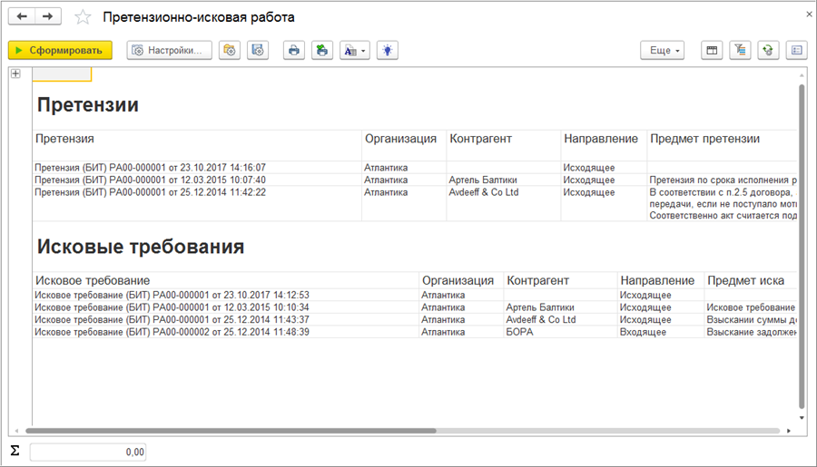 Отчет «Претензионно-исковая работа» показывает все претензии и исковые требования с необходимыми отборами и полями.