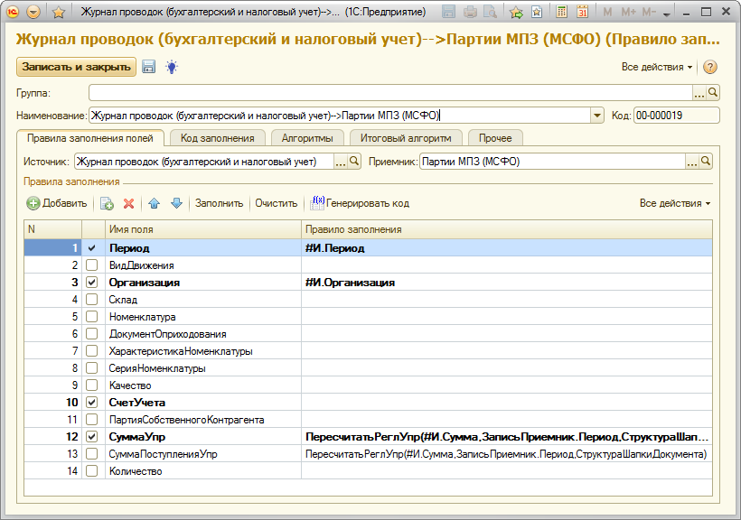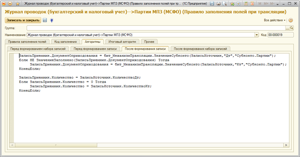 Так же на закладке «Алгоритмы - После формирования записи» автоматически сформируется алгоритм, который используется для заполнения поля «Партии» регистра «Партии МПЗ (МСФО)»: