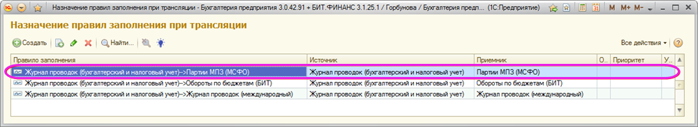 Созданный выше элемент справочника «Правила заполнения полей при трансляции» назначаем в регистре «Назначение правил заполнения при трансляции»: