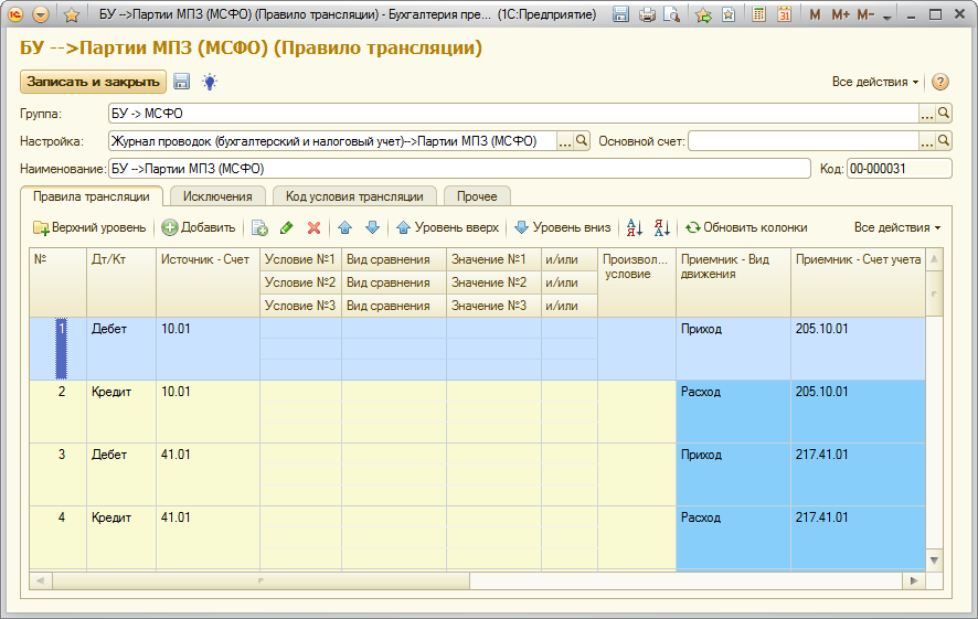 Пример: Необходимо настроить трансляцию движений со счетов РСБУ 10 и 41 в партионный регистр «Партии МПЗ (МСФО).