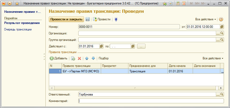 Созданные выше элемент справочника «Правила трансляции» назначаем с помощью документа «Назначение правил трансляции»: