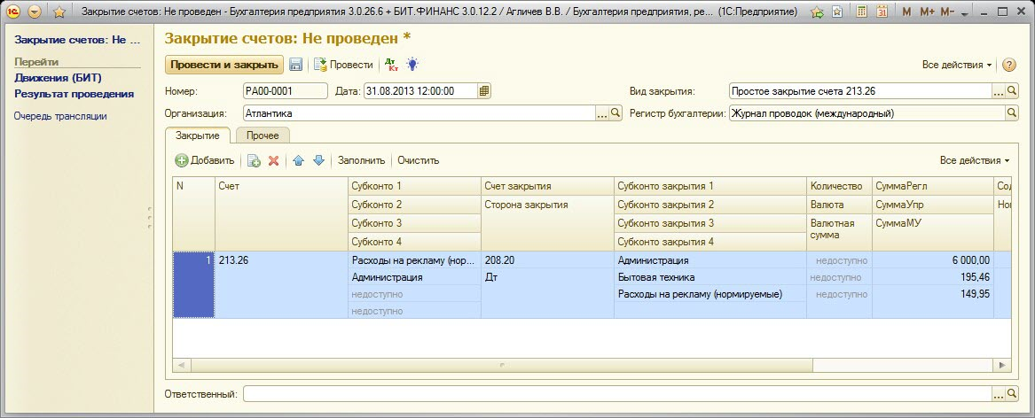 В результате закрытия счетов с видом «Простое» формируется сводная проводка по переносу оборотов с одного счета на другой без какого-либо распределения:
