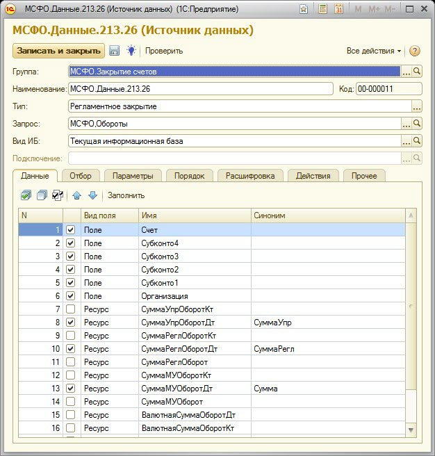 Настроим элемент справочника «Источники данных», который должен возвращать данные, подлежащие распределению по счету 213.26, и будет использован в справочнике «Настройки закрытия счетов» (Поле «Данные»):
