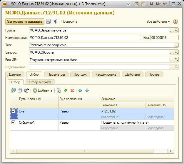Настроим элемент справочника «Источники данных», который должен возвращать данные, подлежащие распределению по счету 712.91.02, и будет использован в справочнике «Настройки закрытия счетов» (Поле «Данные»):