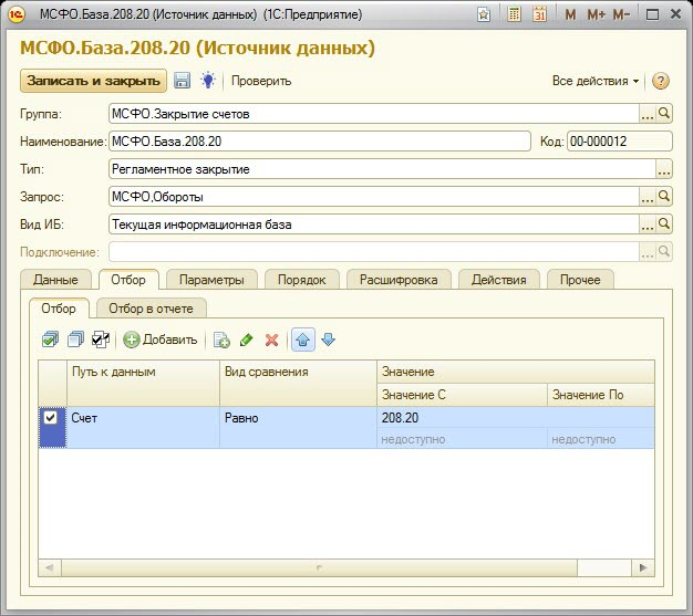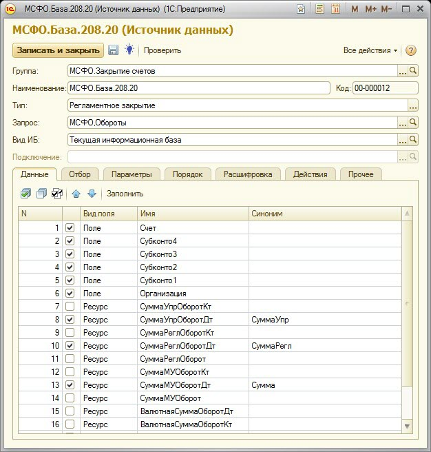 Также настроим элемент справочника «Источники данных», который должен возвращать базу по счету 208.20, пропорционально которой будет выполняться распределение, и будет использован в справочнике «Настройки закрытия счетов» (Поле «База»):