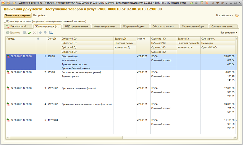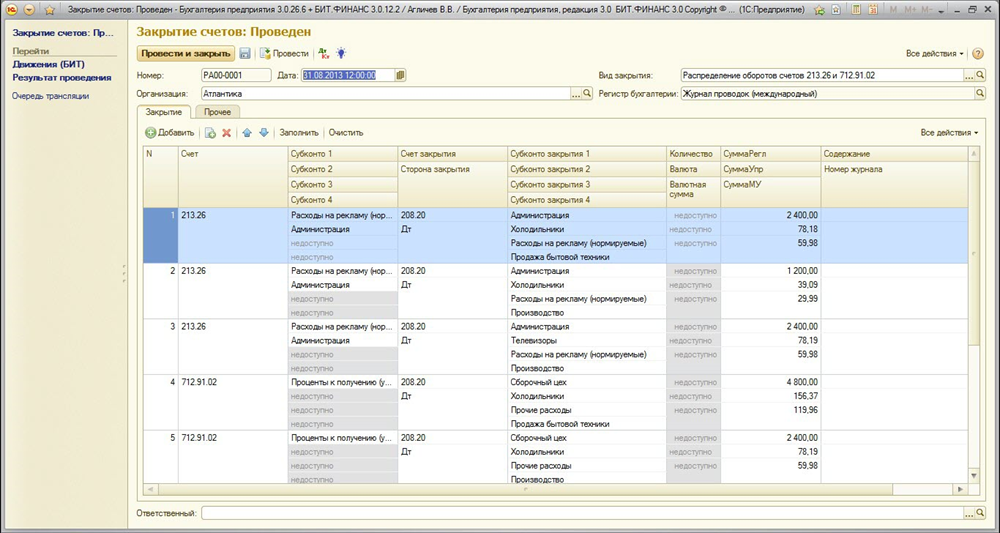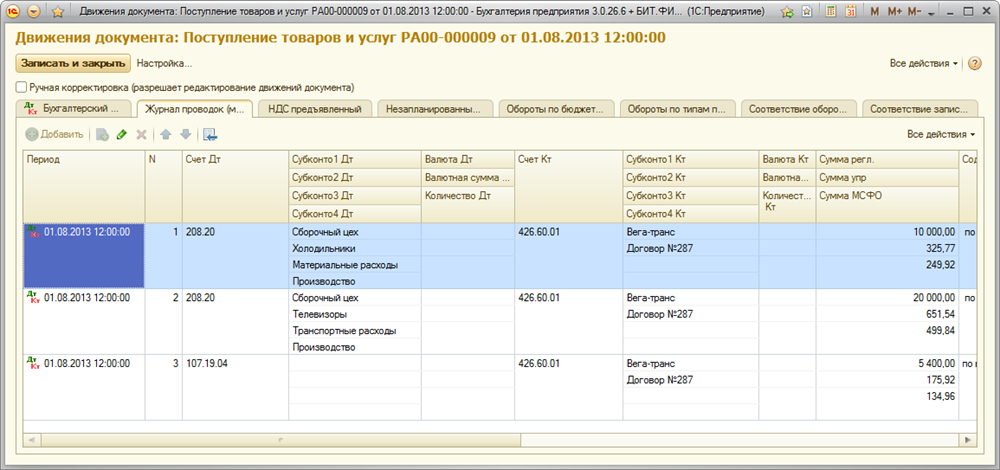 Результат проведения документа по МСФО: