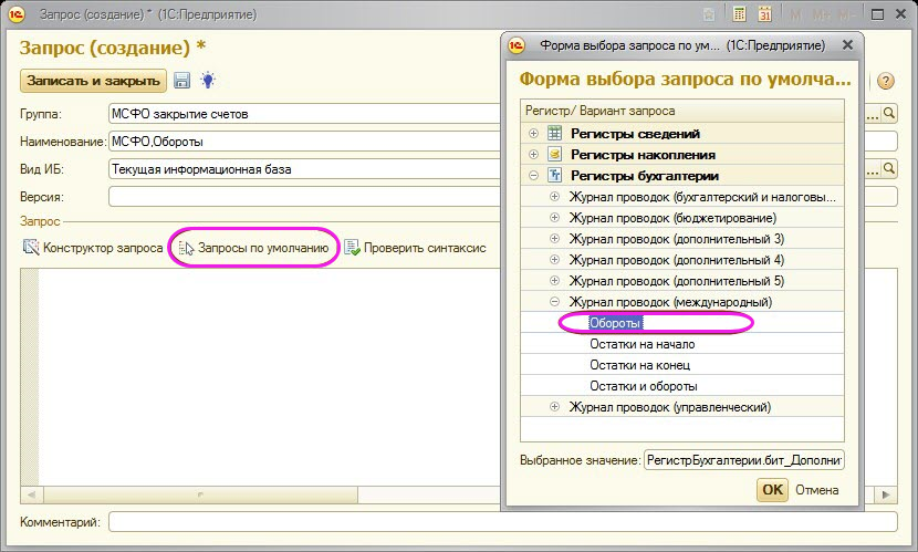 Для автоматической генерации запроса можно воспользоваться кнопкой «Запросы по умолчанию» и в открывшейся форме выбора выбрать регистр «Журнал проводок (международный)» - «Обороты».