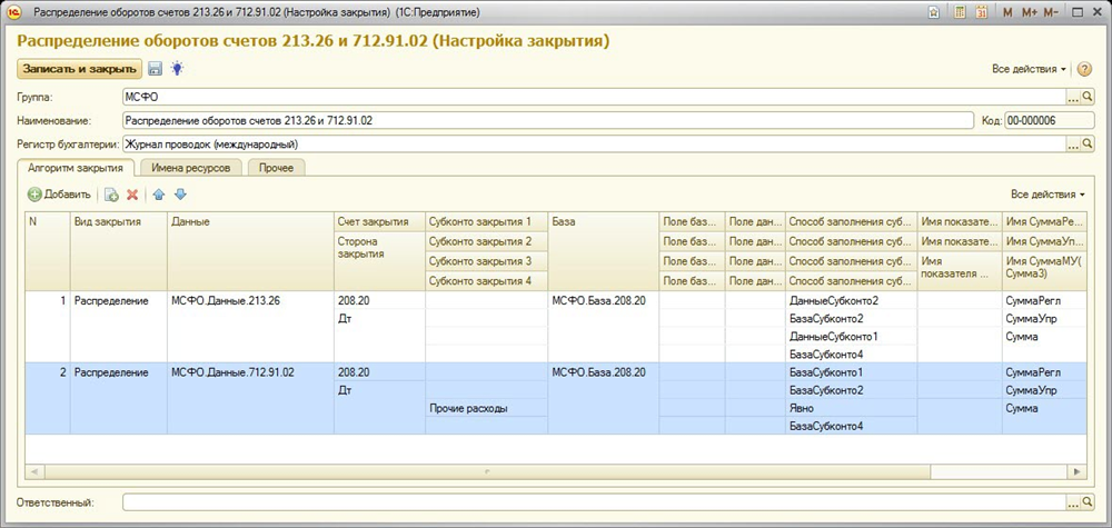 По условию данные со счета 213.26 должны распределятся на счет 208.20 пропорционально аналитикам «Номенклатурная группа» и «Проект» базы распределения. Для соответствующих субконто (Субконто 2 и Субконто 4) укажем способ заполнения «БазаСубконто» («БазаСубконто2» и «БазаСубконто4»). В том случае, если для субконто не задан способ заполнения, то при наличие его в данных к распределению, оно будет переносится по умолчанию, что равнозначно способу заполнения «ДанныеСубконто». То есть для субконто «Подразделения» и «Статьи затрат» укажем способ заполнения «ДанныеСубконто» («ДанныеСубконто2» и «ДанныеСубконто1»).