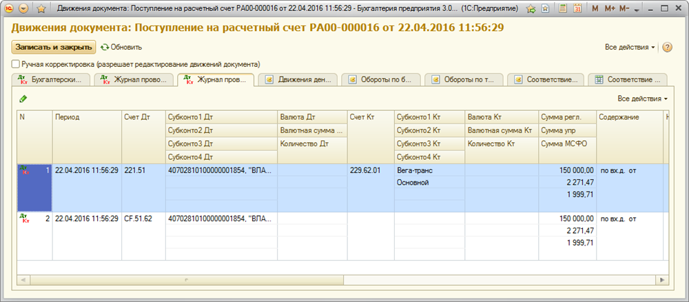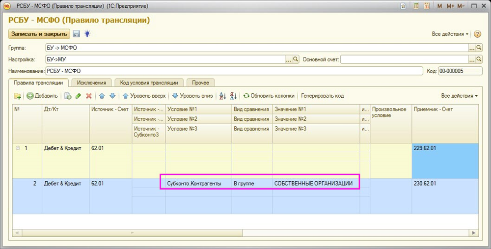 Стоит обратить внимание на то, что правило №2 подчинено правилу №1 и является более приоритетным. Это значит, что движение по счету РСБУ 62.01 будет оттранслировано на счет МСФО 230.62.01 только в том случае, если контрагент находится в группе «Собственные организации», во всех остальных случаях трансляция будет осуществляться на счет 229.62.01.