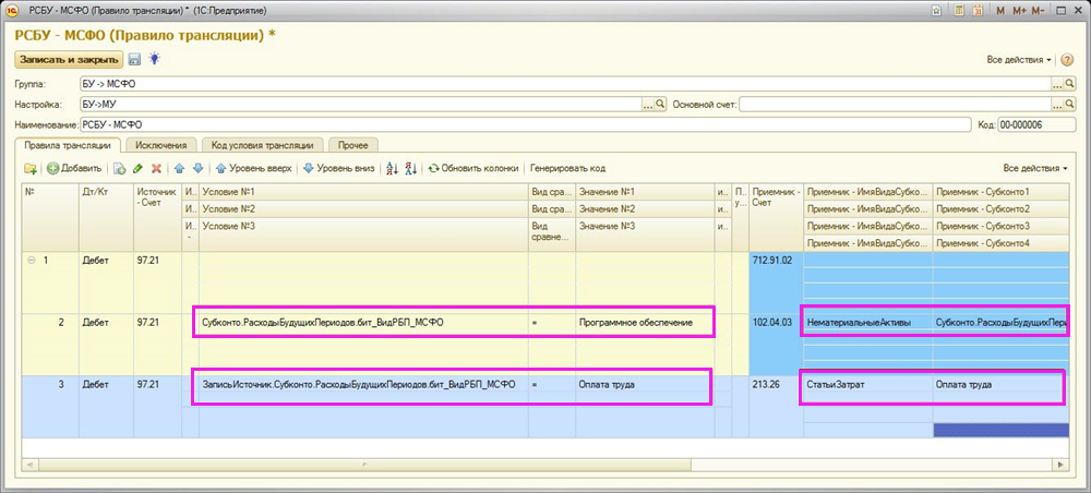 Пример 3: Требуется транслировать затраты по программному обеспечению со счета РСБУ 97.21 на счет МСФО 102.04.03, затраты по оплате труда на счет МСФО 213.26, во всех остальных случаях расходы будущих периодов относить на счет МСФО 712.91.02