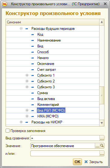 В условие используется проверка на значение дополнительного реквизита «Вид РБП» справочника «Расходы будущих периодов»: