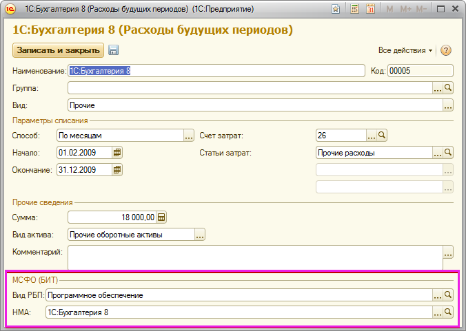 Также в справочнике «Расходы будущих периодов» в реквизите «НМА» можно задать нематериальный актив, который будет подставляться на счет МСФО при трансляции:
