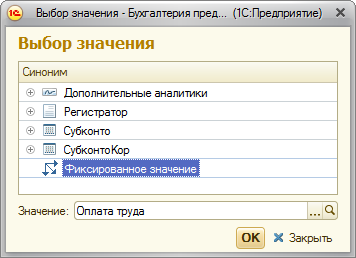 Для этого в форме выбора значения необходимо выбрать поле «Фиксированное значение» и в поле «Значение» указать требуемый элемент из справочника «Статьи затрат»: