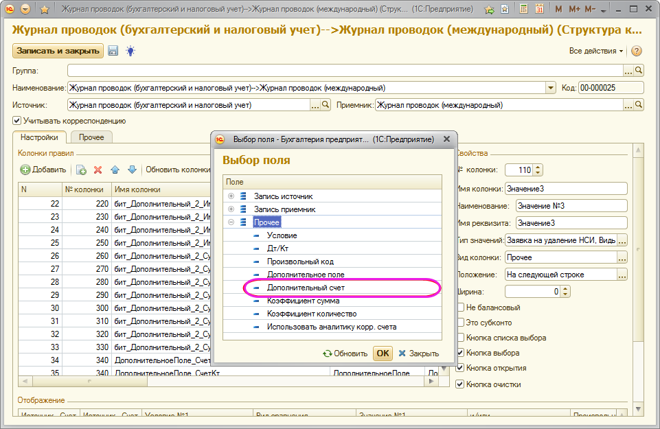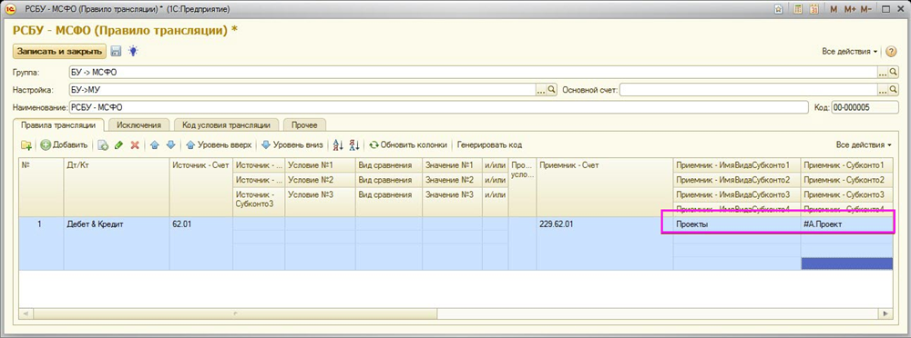 Для того, чтобы при трансляции данных на счет МСФО 229.62.01 субконто «Проект» заполнялось автоматически из дополнительной аналитики «Проект» первичного документа требуется указать способ заполнение в поле «Приемник – Субконто».