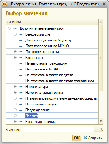 Для этого в форме выбора значения в ветке «Дополнительные аналитики» следует выбрать аналитику «Проект»:
