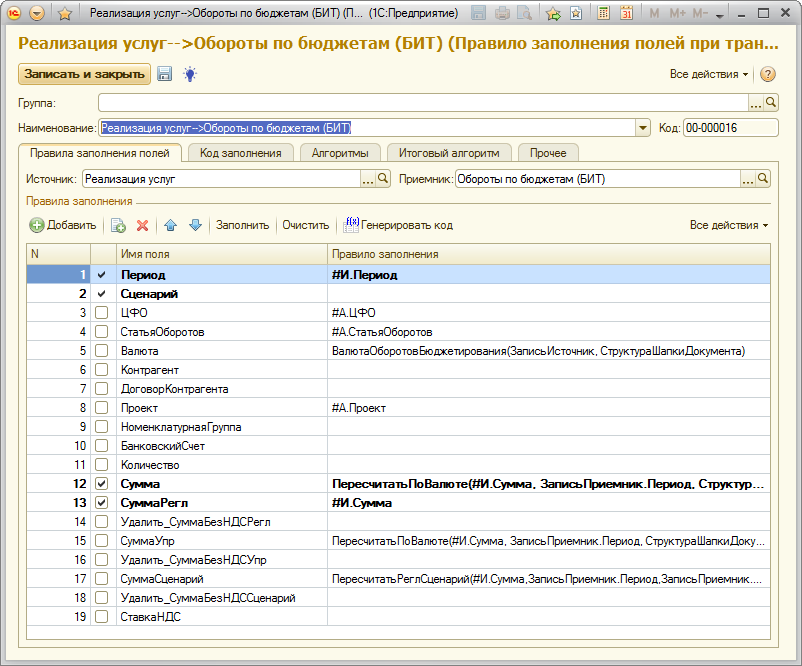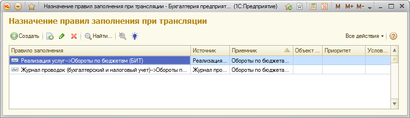 1.Создаем элемент в справочнике «Правила заполнения полей при трансляции» для трансляции из регистра «Реализация услуг» в регистр «Обороты по бюджетам(БИТ)»: