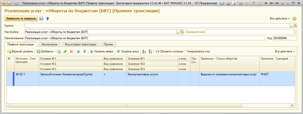 4.Создаем новый элемент в справочнике «Правила трансляции» для трансляции данных по консалтинговым услугам из регистра накопления «Реализация услуг» в регистр «Обороты по бюджетам (БИТ)» на сценарий «ФАКТ» и статью оборотов «Выручка от оказания консалтинговых услуг»: