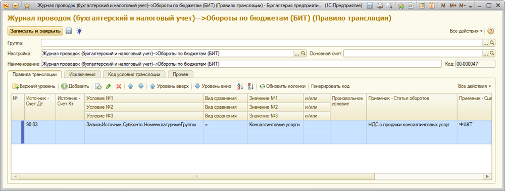 5.Создаем новый элемент в справочнике «Правила трансляции» для трансляции данных по НДС из регистра «Журнал проводок (бухгалтерский и налоговый учет)» в регистр «Обороты по бюджетам (БИТ)» на сценарий «ФАКТ» и статью оборотов «НДС с продажи консалтинговых услуг»: