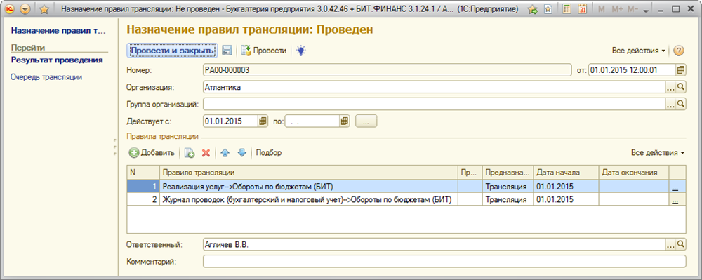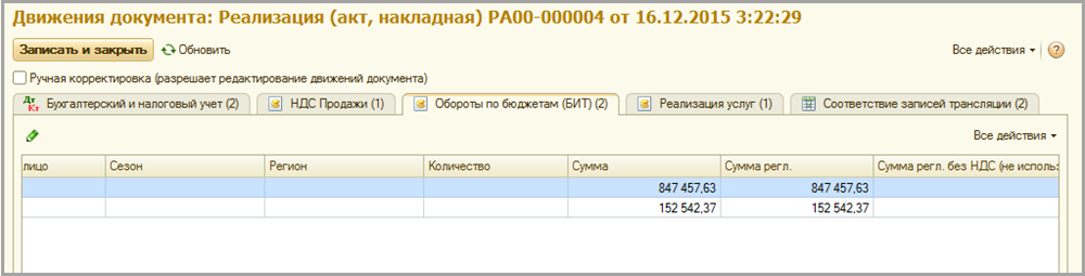 Результаты трансляции в регистре «Обороты по бюджетам (БИТ)»: