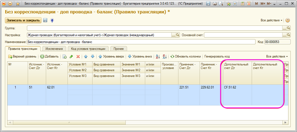 Вид правил трансляции с дополнительными счетами для задания второй проводки представлен на скриншоте: