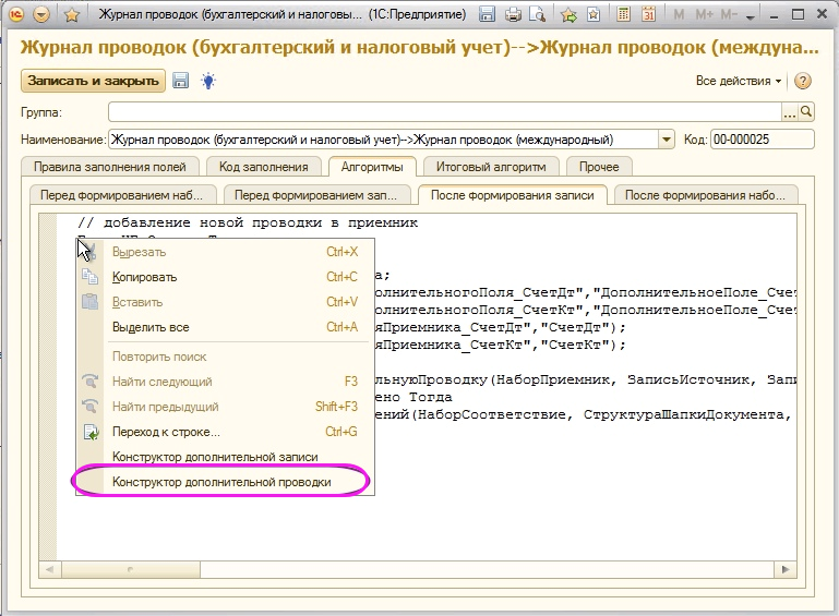 Также в справочник «Правила заполнения полей при трансляции» на закладке «Алгоритмы – После формирования записи» необходимо воспользоваться «Конструктором дополнительной проводки», вызвать который можно из контекстного меню: