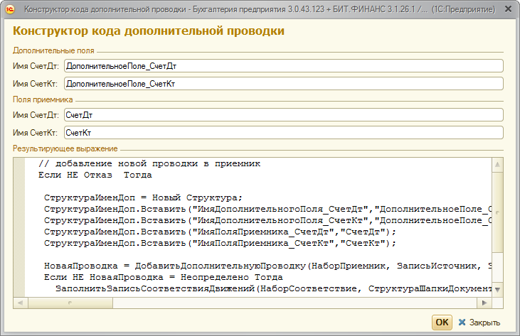 С помощью помощника создается программный код, который необходим для формирования второй проводки: