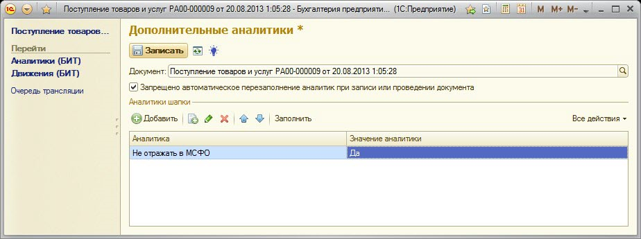 Для того, чтобы выбранный документ не транслировался в МСФО, служит дополнительная аналитика документа «Не отражать в МСФО» (в значение «Да»):