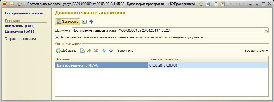 Аналитика «Дата проведения по МСФО» может быть добавлена в документ вручную, либо назначена документу в разделе «Настройки (БИТ)» - «Назначение дополнительных аналитик документам».