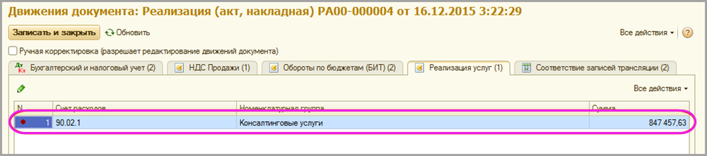Пример 5: Выручка от реализации услуг отражается с помощью документа «Реализация (акты, накладные)». Требуется транслировать данные по выручке из регистра накопления «Реализация услуг» (поскольку в данном регистре выручка отражается сразу без НДС, в отличие от проводки по бухгалтерскому учету) в регистр «Обороты по бюджетам (БИТ)». Так же требуется транслировать данные по НДС из регистра «Журнал проводок (бухгалтерский и налоговый учет)» по счету 90.03 в регистр «Обороты по бюджетам (БИТ)» на отдельную статью затрат.