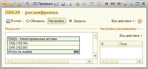 Расшифровать отчетом – выполняется расшифровка ячейки другим произвольным отчетом. Связь ячейки и отчета для расшифровки настраивается в справочнике «Элементы данных» (Закладка «Расшифровка» - «Расшифровка отчетом»);