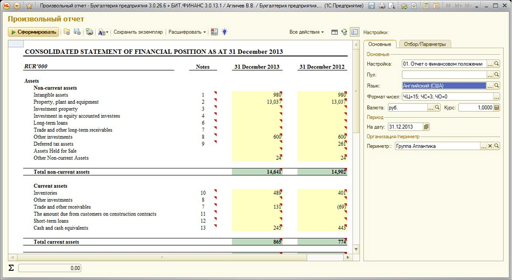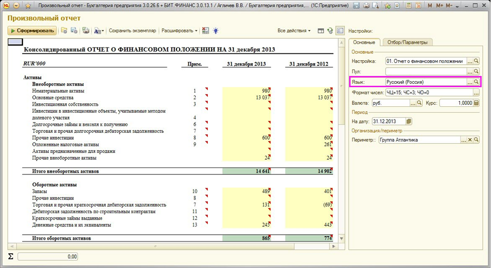Если в настройке отчета заданы несколько языков вывода, отчет может выводиться на каждом из этих языков по выбору пользователя. Например, отчет о финансовом положении на русском языке:
