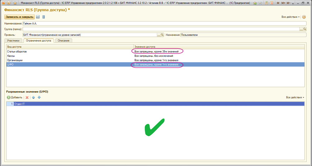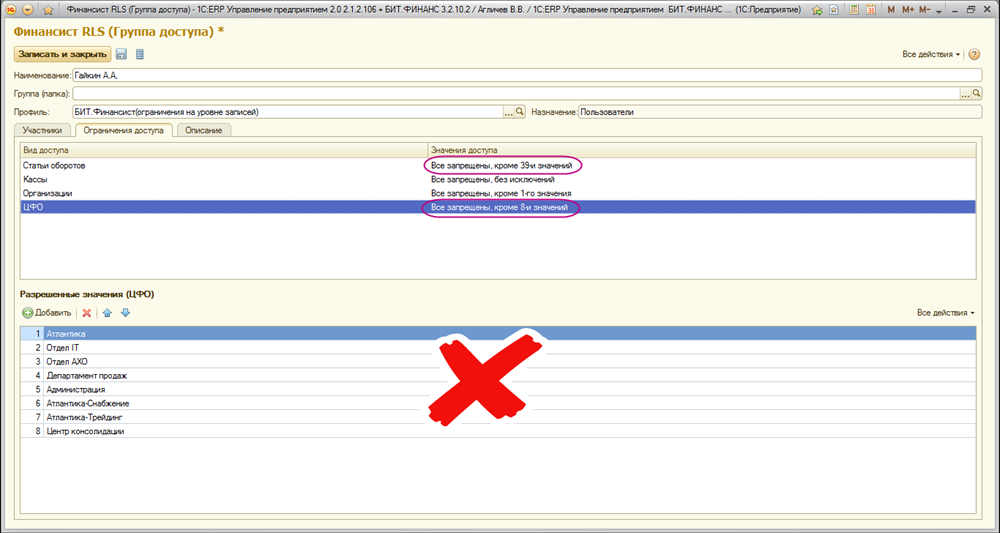 Допустим, в компании есть ФЦО – ИТ обеспечение, у него есть руководитель – Гайкин А.А. Данный руководитель должен иметь доступ ко всем статьям БДДС, так как он должен подавать плановые данные по БДДС для своего ЦФО (Центр финансовой ответственности) – ИТ. Но так как, Гайкин А.А. также является и руководителем ФЦО – ИТ обеспечение, и должен планировать и контролировать расходы по статьям ИТ и всех других ЦФО, то сначала кажется что мы должны дать ему доступ еще и на все другие ЦФО в компании. В случае, если это будет один пользователь информационной базы, то Гайкин А.А. сможет видеть все статьи БДДС по всем ЦФО, мы не рекомендуем использовать такую настройку без необходимости! Это может привести к утечке информации, которую не должен был видеть пользователь.