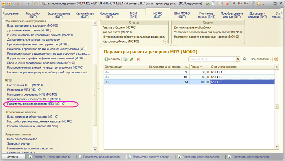 Регистр сведений «Параметры расчета резервов МПЗ (МСФО)» используется для формирования резервов в документе «Начисление резерва по МПЗ (МСФО)», согласно срокам задолженности и установленному проценту.