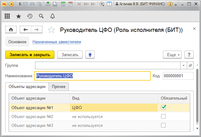 Для каждой роли может быть указано до трех объектов адресации. Виды объектов адресации хранятся в плане видов характеристик «Виды объектов адресации задач», для каждого вида указывается один из трех типов данных: Организация, ЦФО или Проект.