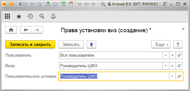 Далее, в регистре «Права установки виз» создается новая запись, в которой будут установлены права для роли «Руководитель ЦФО». В качестве пользователя выбирается группа «Все пользователи».