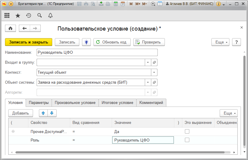 Теперь для роли «Руководитель ЦФО» назначены права установки визы «Руководитель ЦФО». Причем, несмотря на то, что мы создали пользовательское условие для документа «Заявка на расходование денежных средств», данное условие будет применяться для всех документов БИТ.ФИНАНС, в которых присутствует реквизит «ЦФО, и в маршруте визирования которых присутствует виза «Руководитель ЦФО».